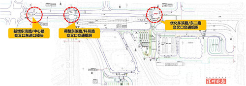另一方面,市交委根据东滨路交通运行情况,将进一步打通科苑路东滨路交叉口南北向直行,并加设直左车道,缓解交叉口南进口右转交通压力。