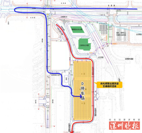 ▲改造后社会车辆停车和出境货车交通组织流线。