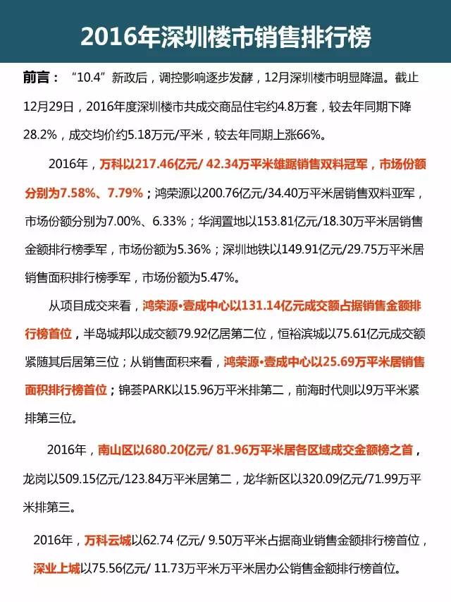 2016年深圳楼市排行榜:房企 住宅 片区 商业 办公top10全在这