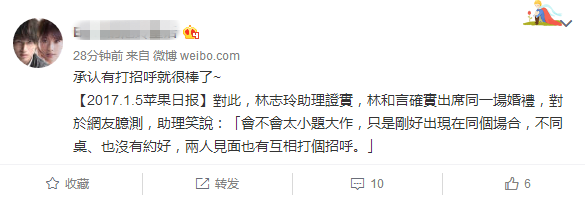 有网友发现台湾媒体倒是跟志玲姐姐的助理打听了一下,得到的回复是“不同桌、也没约好,两人见面也有互相打个招呼”。
