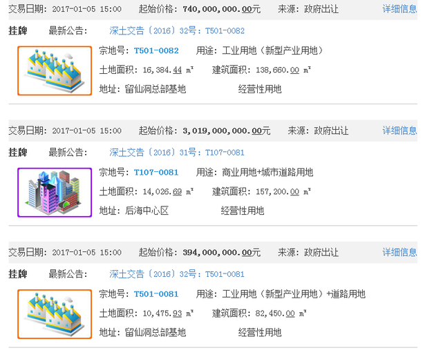 均位于南山区,分别由安邦财险、大疆、乐普竞得