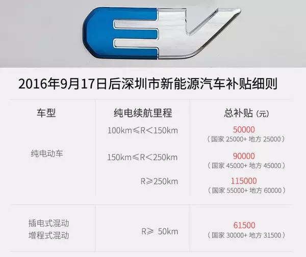 深圳地区内的补贴,续航小于 150km 的纯电动车补贴为25000元,续航小于 250km 的纯电动车补贴为45000;续航大于等于 250km 的纯电动车补贴为60000另外,增程式/插电式混动车(续航大于等于 50km)补贴为31500元。