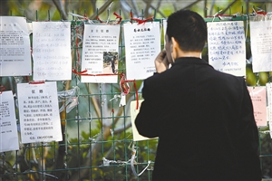 莲花山公园相亲角,一位中年男性在众多征婚启事前“驻足”。