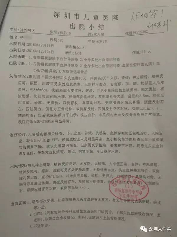 出院小结显示,小星星血小板聚集功能明显下降,葛女士认为淤青与此有关。