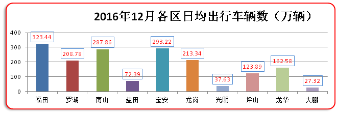 按照各行政区本月日均出行车辆数统计,福田区交通压力依旧最大,达323.44万辆次,随后是宝安区293.22万、南山区287.86万辆次,最低的是大鹏新区,为27.32万辆次,随后是光明新区37.63万辆次。