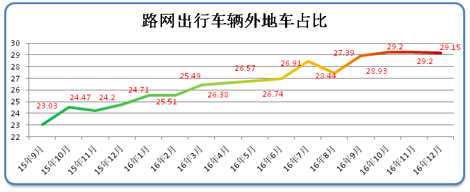 11月,全市路网中平均每日出行的机动车中,外地车占总量的29.15%,车辆数较上月增加2.88%,但占比较上月下降0.16%。 自2015年9月以来,外地车在我市车辆构成占比已连续上升10个月,8月份出现小幅下降,但下半年我市外地车数量仍呈现上升趋势,12月虽然占比较上月小幅下降,但其总车辆数仍比11月增加了近3个百分点,其形势不容乐观。