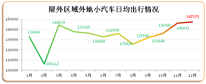 同时,通过监测4月15日后限外区域的日均外地小汽车出行量,外地小汽车出行量逐步上升,12月份出行量为147171辆,较11月份增加0.78%,继续呈现上涨现象。