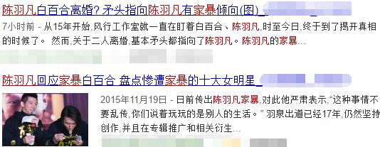 另外一种离婚原因是陈羽凡有“家暴”倾向,导致白百何要与他离婚,而且前几天白百何秒删的一条微博“这个时代利益关系充斥在工作、交友等本来更加纯净的空间里,还好在感情上你有自主选择权…”加上白百何微博没有任何和陈羽凡秀恩爱的内容,网友称两人已经离婚。