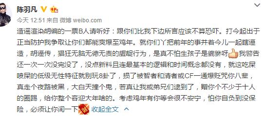 有了网友的推测,两人离婚似乎已经成了事实,今天陈羽凡终于忍不住发微博怒斥造谣者称“不怕生孩子是貔貅呀”,而且声明网友爆料的东西都是很久之前发生的事情,没有一点逻辑和时间观念,更恐吓“若真让我或弟兄们逮到了,赠你个不少于十人的圈踢,给你整个容迎大年啥的”。