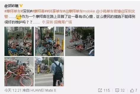 网友@郑沛翊在招商局广场拍的一幕,并发微博感慨到:作为一个摩拜客在路上目睹了这一幕有点心塞,这么便民的措施不能得到很好的维护吗??