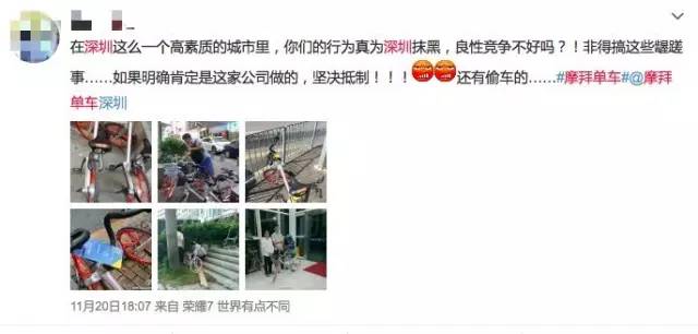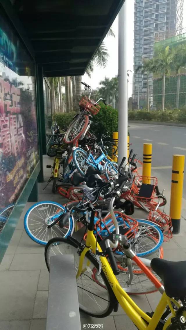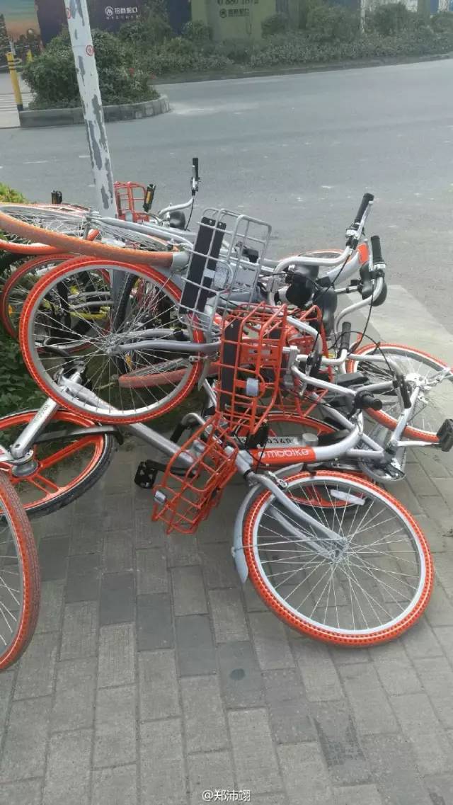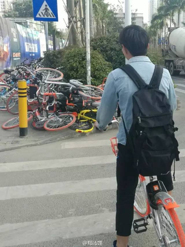 网友@郑沛翊在招商局广场拍的一幕,并发微博感慨到:作为一个摩拜客在路上目睹了这一幕有点心塞,这么便民的措施不能得到很好的维护吗??