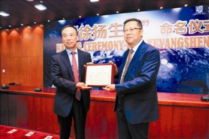 国家天文台党委书记赵刚教授为徐扬生教授(左)颁授命名证书和轨道运行图。学校供图