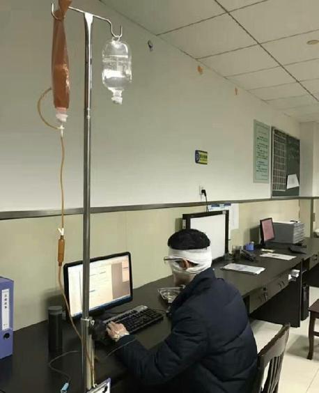 因头缠纱布、挂着点滴却坚持为患者写病历,湖南湘潭市一名医生工作照被朋友上传至网络后意外走红。 网友 缄小辰 图