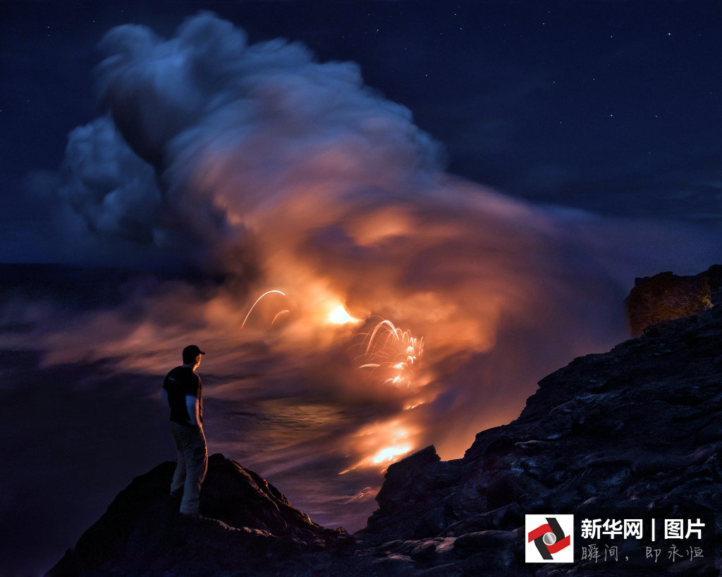 2017年1月12日,基拉韦厄火山是世界上最活跃的火山之一,这组震撼的图片展示了几名游客在喷发后的火山前拍照的画面。画面中巨大的烟云滚滚直上云霄,火红的岩浆汹涌翻腾,炽热的岩浆流冒着泡泡,然后涌入大海。美国摄影师Miles Morgan在夏威夷基拉韦厄火山拍摄下了这些壮观的画面。