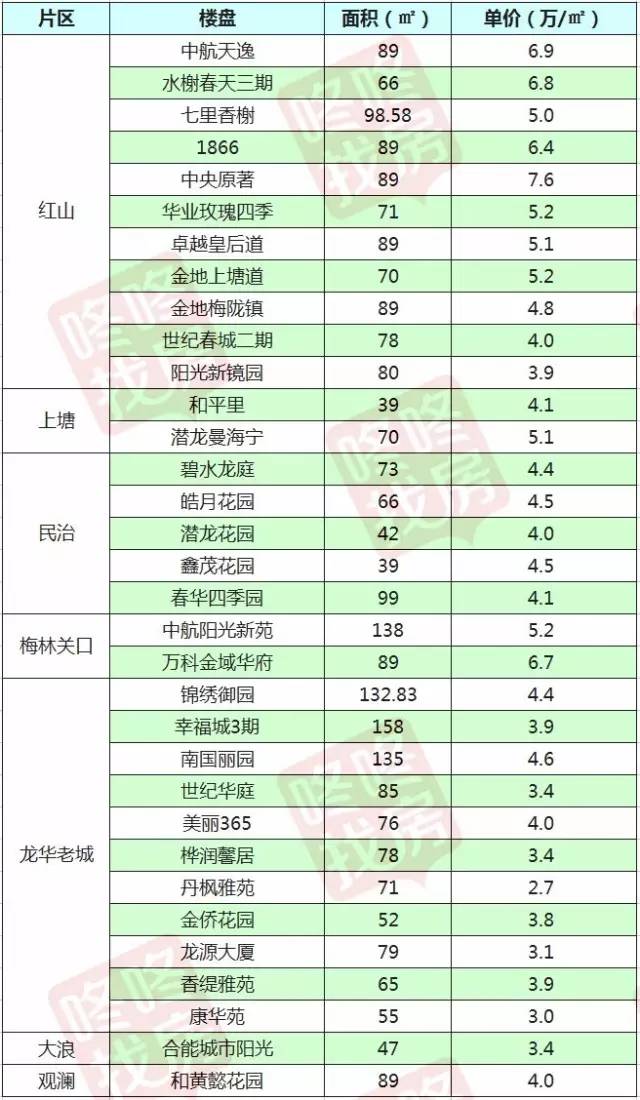 龙华区的红山片区成交比较活跃,其中水榭春天和中航天逸关注度较高。