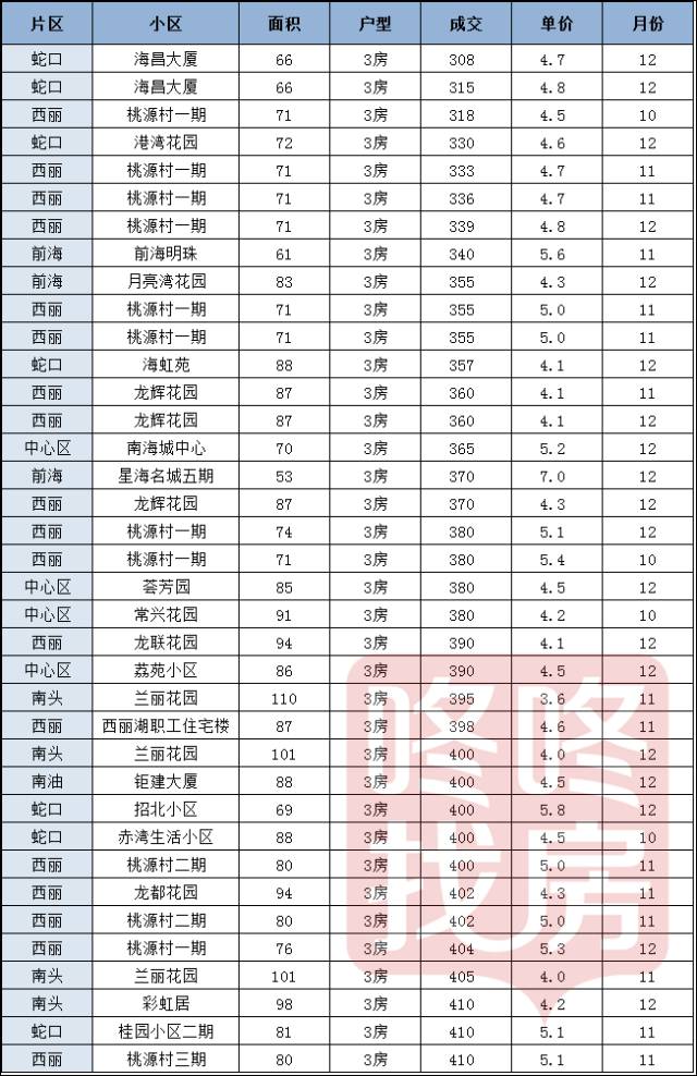 从上述图标统计结果来看,该价位段买三房的话,西丽是最为合适的,在成交的37套当中,西丽占了19套,也就是说400万三房,西丽就占了一半,刚需之地果真名不虚传。