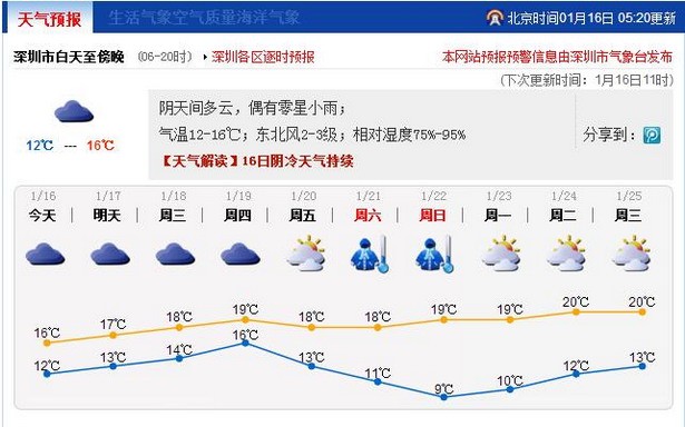 预计今天到明天深圳日温差小,间有小雨,今日最低气温低至12℃,明日最低气温13℃。18日~19日云量仍较多,气温略回升。20日起受新一股冷空气影响,北风加大,气温下降,空气干燥,白天阳光充足,昼夜温差加大。