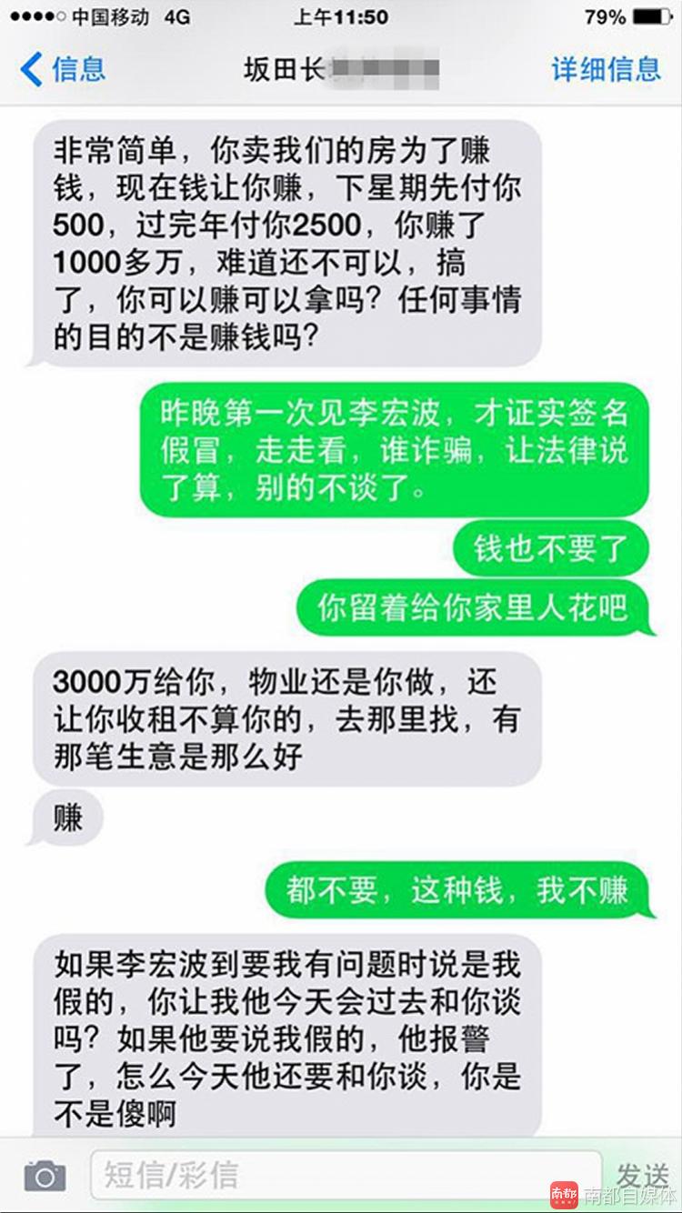 李宏波的委托人林晓驰也未接听南都记者电话。据罗女士出示的与林的短信记录,林曾表示,可以付给罗女士3000万,暗示罗女士“罢手”。罗女士则说,涉及签名假冒,“这个钱我不能赚”。
