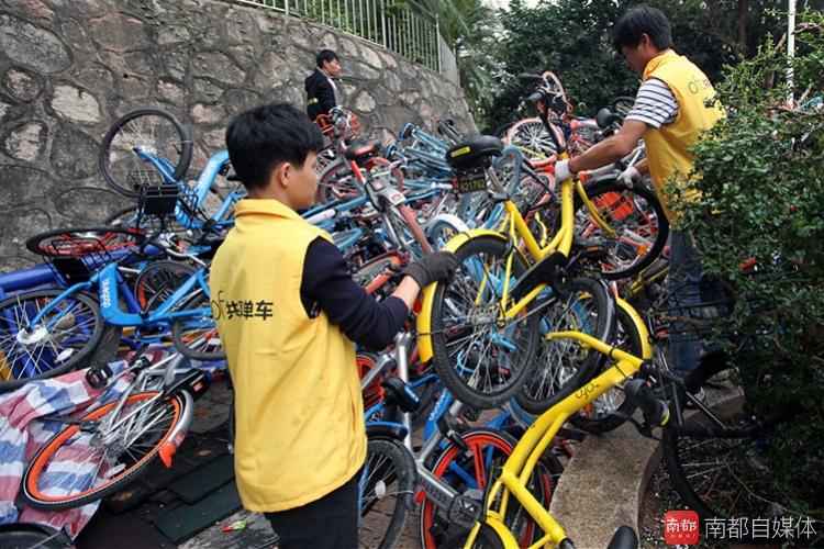 2017年1月16日。深圳南山湾厦村公园。多家共享自行车公司的工作人员前来把自己单车抬走。南都记者 赵炎雄 摄