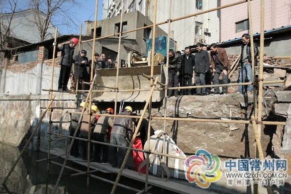 14日,随着大型铲车的缓缓起吊,隐埋在锁桥湾市河驳岸中60余载的一块石碑终于重见天日。石碑为汉白玉质地,高1.73米、宽0.79米、厚0.23米、重1.5吨。石碑上的文字,是清嘉庆二年由常州知府胡观澜为重修大观楼而撰。