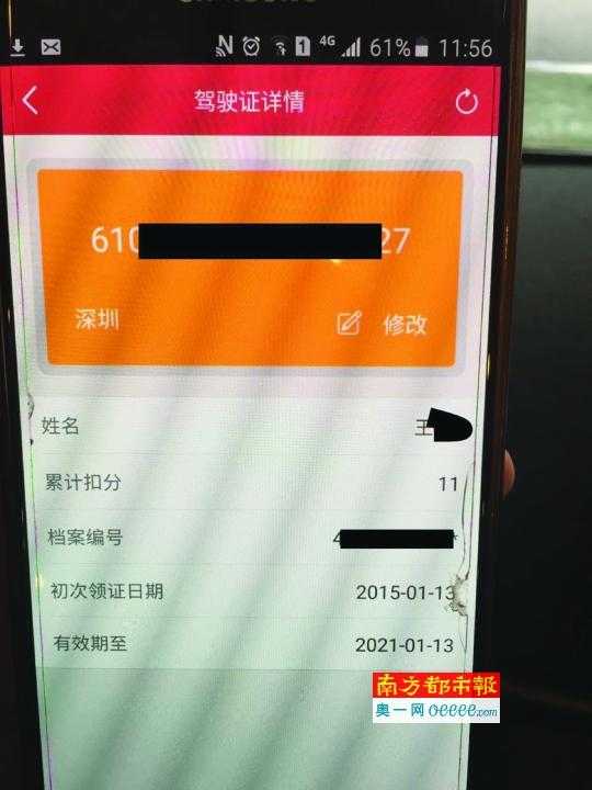 王小姐来自陕西大荔,在深圳工作多年,2015年1月13日拿到了C 1机动车驾驶证。她介绍,去年10月曾在深圳湾口岸片区的终端机办理业务,发现驾照绑定的手机号码是一个130开头的号码,不是她平时用的,不过当时她并没有立即去调查这个问题,到今年1月11日,也就是驾照记分周期即将结束时才到松岗车管所办理了驾照档案手机号变更,当天24小时后才能生效。到当天下午,她的驾照突然被扣掉了11分。