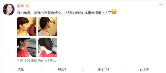 1月16日,李念在微博上发了一组在《新世界》剧中发型照,并附文“我们组男一说我的发型像虾饺,从那以后我的体重就慢慢上去了。”照片中,李念绑着蝎子辫,看起来十分俏皮。看到李念自黑,一些网友回复“剧组伙食不错呀,好像脸是比以前圆了。”“怪不得最近又勤去健身房啦!”
