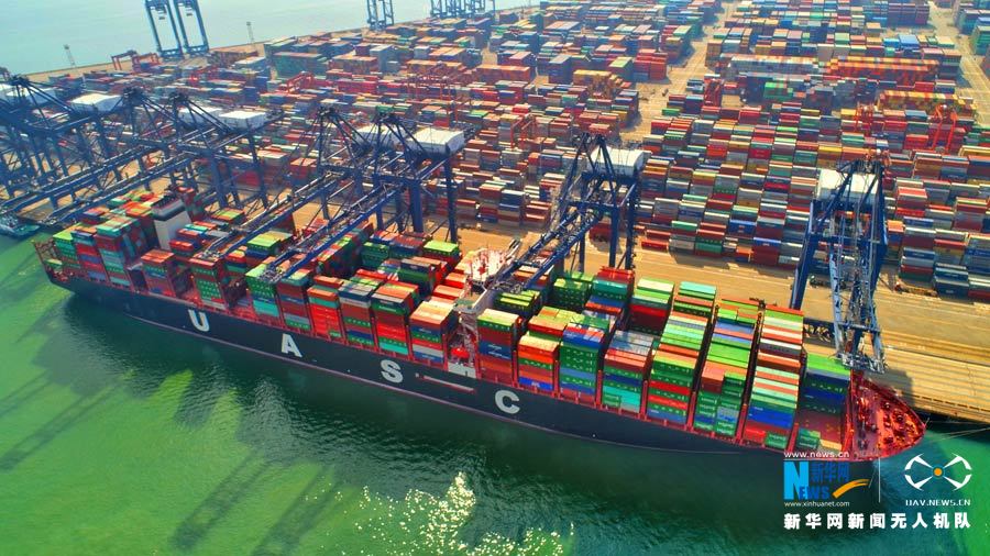 满载集装箱的货轮正停靠在港口。新华网发 于荣海 黄波摄