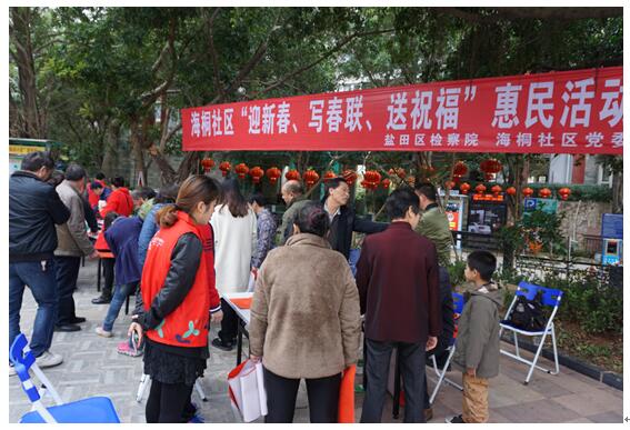 深圳新闻网盐田讯 2017年春节将至,为了营造喜庆详和的节日氛围,丰富春节期间的群众文化生活,1月17日下午,海桐社区党委联合盐田区检察院开展“迎新春、写春联、送祝福”传统文化惠民活动。本次活动邀请到本区有名书法爱好者和部分社区离退休老党员参与现场挥毫泼墨。