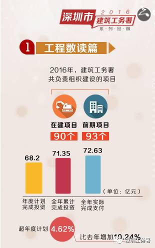 2016年,是深圳市建筑工务署打造持续领先的国内一流政府工程管理机构的开局之年;也是打基础、破难题、谋长远,进一步提高管理水平、提升工程质量的一年。这一年,工务署负责组织建设的项目共 183个,其中,在建项目90个,前期项目93个,年度计划完成投资 68.2亿元,全年累计完成投资71.35亿元,超年度计划4.62%(比去年增加10.24%),全年实际完成支付 72.63亿元(含竣工项目结决算款及工程预付款)。