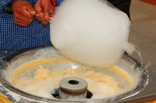 有时候在大街小巷里,便能看到卖棉花糖的老伯伯。将糖撒入正在打圈圈的机器里,然后用木签放入其中转啊转,很快就裹成一个大大的棉花糖啦。