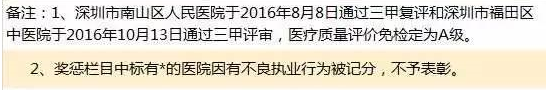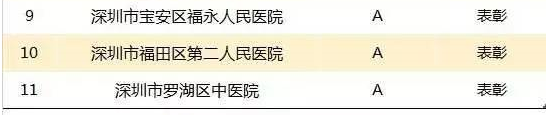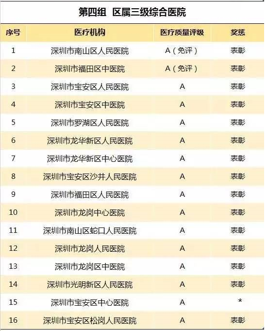 深圳市卫计委对北京大学深圳医院等62家评为A级医疗质量单位且无不良执业行为记录的单位予以通报表彰,其中包括在2016年通过三甲复评的南山区人民医院、在2016年通过三甲评审的福田区中医院。