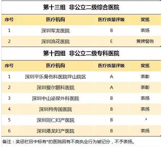 本年度被评为E级医疗质量的深圳华丹医院、深圳流花医院、深圳远大肛肠医院等3家医院及2015年、2016年连续两年评为D级的深圳六联医院被黄牌警告。