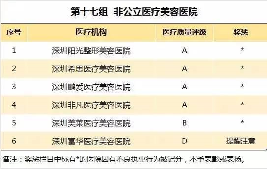 深圳富华医疗美容医院等7家医院被评定为D级单位,比2015年减少7家;