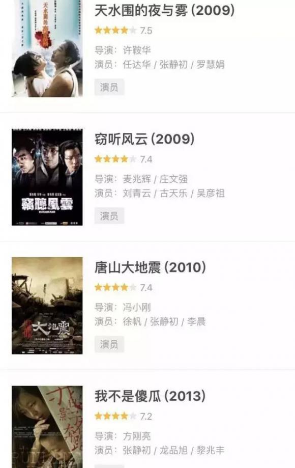 当然孔雀之后,张静初也照例拍了一些叫好又叫做的电影,7.4-7.5的评分在电影中算是极好的,可看性极强。