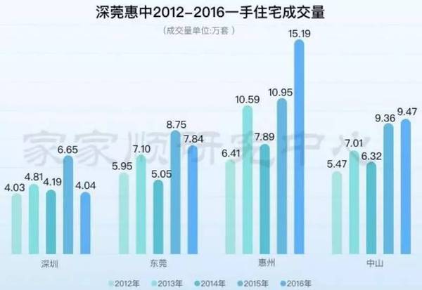 对比2014年,2016年惠州一手住宅成交量直接翻倍,与同为临深城市的东莞、中山相比,惠州也遥遥领先。深圳过去3年的一手住宅总量还不及惠州2016年的全年成交。