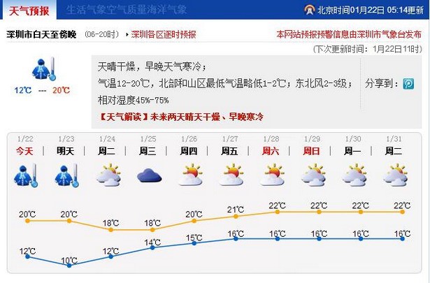 市气象台预测,23日,深圳维持晴冷干燥天气,昼夜温差大,最低气温仍在10℃左右,北部和山地早晨再低1~2℃。24-25日,云量增多、湿度加大,偶有分散小雨。26-27日,转多云天气为主,可见阳光。