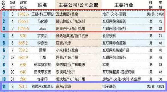 据悉, 2016年中国富人榜,前三位被“王健林、王思聪父子以及马云、马化腾”包揽,章泽天、刘强东夫妻今年名次虽然有所下跌,但保持在前20,原本千亿的身家更是有所增长。