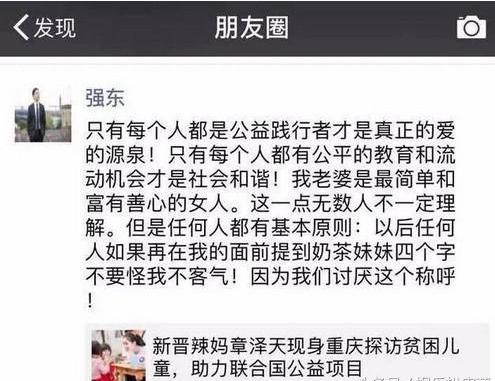 不知道为什么,刘强东比较反感章泽天“奶茶妹妹”这个称号,还曾发朋友圈怒怼网友,说谁再叫“奶茶妹妹”就对他不客气。