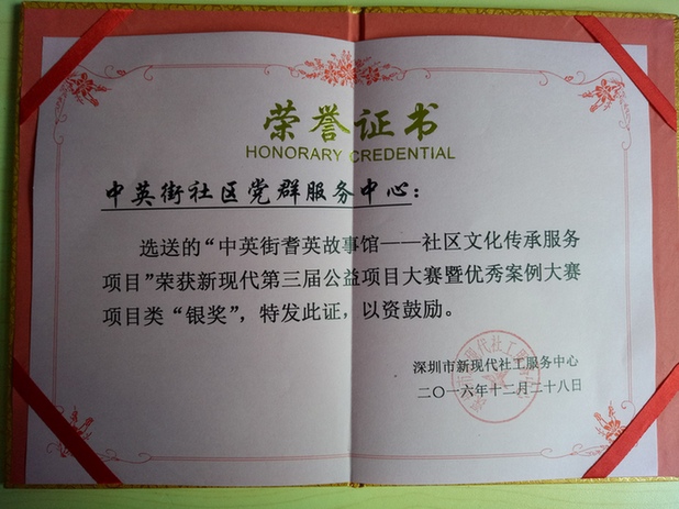 深圳新闻网盐田讯 近日,由中英街社区党群服务中心选送的“中英街耆英故事馆——社区文化传承服务项目”荣获深圳市新现代社工服务中心举办的第三届公益项目大赛“银奖”。