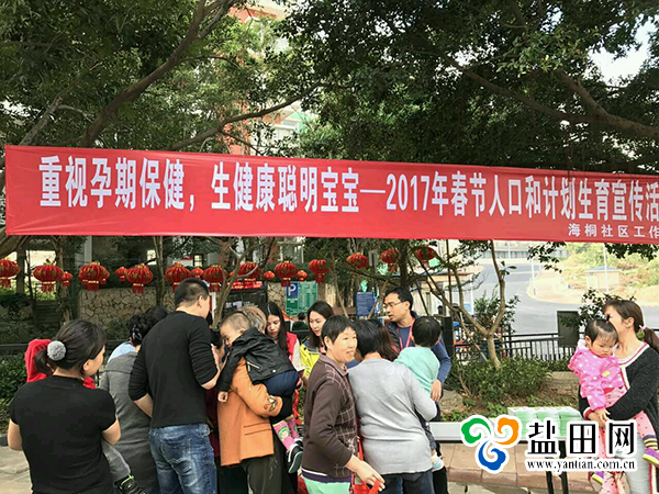 深圳新闻网盐田讯 2017年1月19日下午,为了每个家庭的幸福和社会稳定,预防出生缺陷,宣传计划生育的优生优育及惠民政策,提高辖区群众对计划生育政策知晓率、加强计划生育的管理与服务,海桐社区工作站在半山溪谷小区广场举行了“重视孕期保健,生健康聪明宝宝”为主题的2017年春节计生宣传活动。