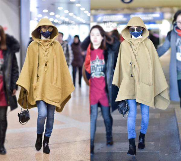 从曝光的照片看,赵丽颖这一身是全副武装,不仅黄色的斗篷装遮住了大半个人,还戴着口罩和黄色墨镜,站在周围的人群中是相当惹眼,然而并没有获得网友称赞而是被吐槽造型土气、衣服太大显得人更矮小,甚至有人说她像套了个麻袋的村姑。