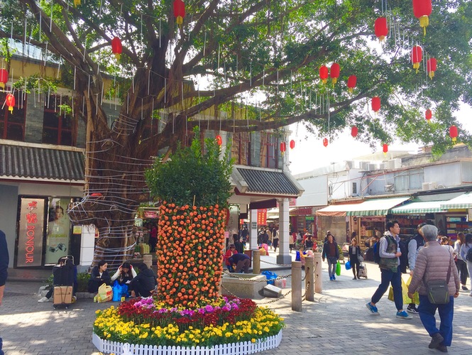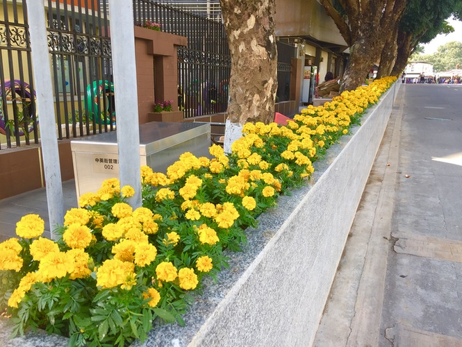 中英街也不例外的装扮起来。通关处的大榕树下和海滨栈道入口摆放了由数千金桔围成的大型金桔树,枝繁叶茂、硕果累累的金桔谐音为“吉”,寓意大吉大利。在步步街围栏一侧,长方形的花坛内盛着娇艳欲滴、夺人眼球的各式花卉;沙头角镇幼儿园外的花坛里金灿灿、黄橙橙。