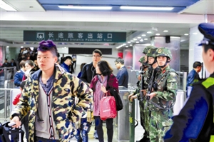 返程高峰边防执勤官兵在深圳火车站出入口执勤,维护治安秩序。IC供图