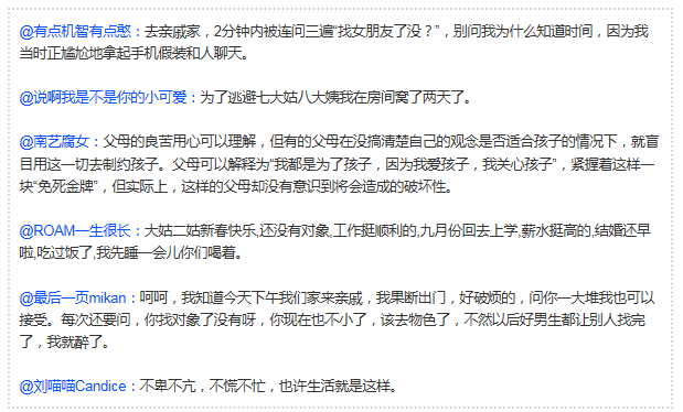 “相亲”这一话题引发的舆论情绪反应较为复杂,与之相关的正面情绪占比仅为64.5%,负面情绪占比为22.1%,显示出这一话题的敏感性,舆论场也出现了诸如“怕面对七大姑八大姨”“每逢佳节被相亲”“中国式相亲”等吐槽话语,客观反映了不少网民的纠结心态。