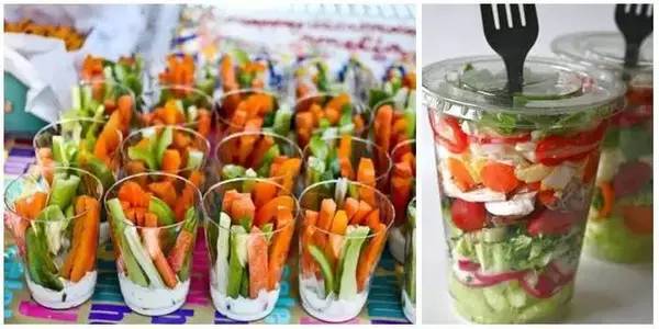 将蔬菜切成条,加入酸奶或者沙拉酱,吃起来非常方便口感又很好。把它们放在塑料杯中,用保鲜膜封口就可以方便带出去啦!