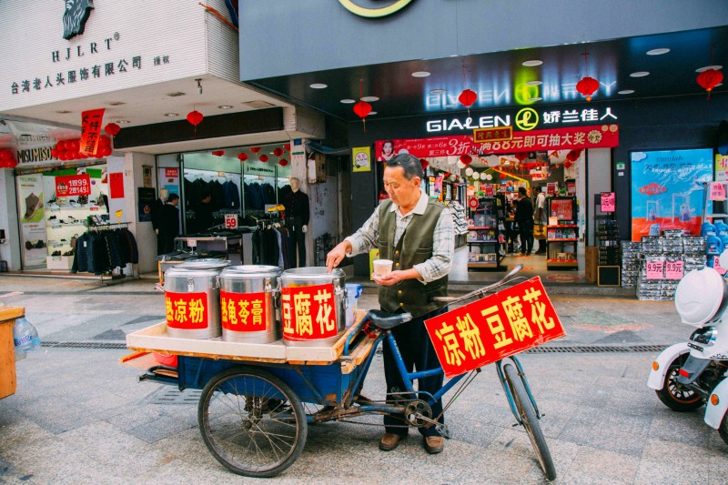 △通往步行街的桥边,卖米糍粑的摊位勾起许多童年回忆