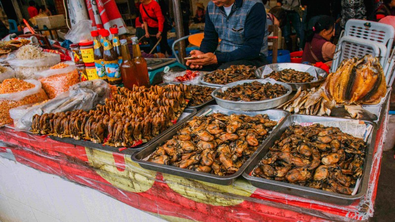 鲜市场外邻河的桥上也十分热闹,尤其是太阳差不多下山的时候,桥上挤满了摆摊的人,各种特色小吃让简直让吃货疯狂。