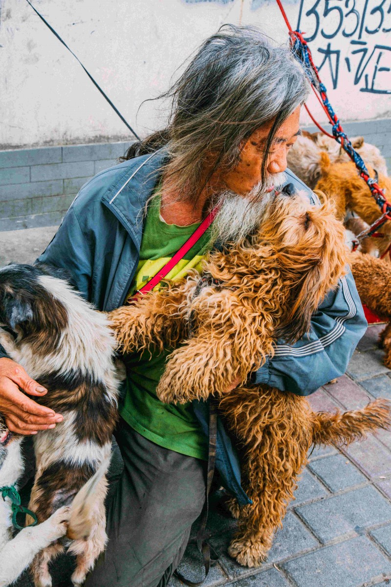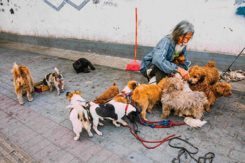 因为刚见面的时候互相礼貌地打了招呼,口音听起来像是个香港人,行为举止也并不像是个疯子,所以忍不住过去跟他聊了起来,再仔细一看这些都是流浪狗,其中有的狗还是残疾的……但却十分听话和依赖这个“流浪汉”。