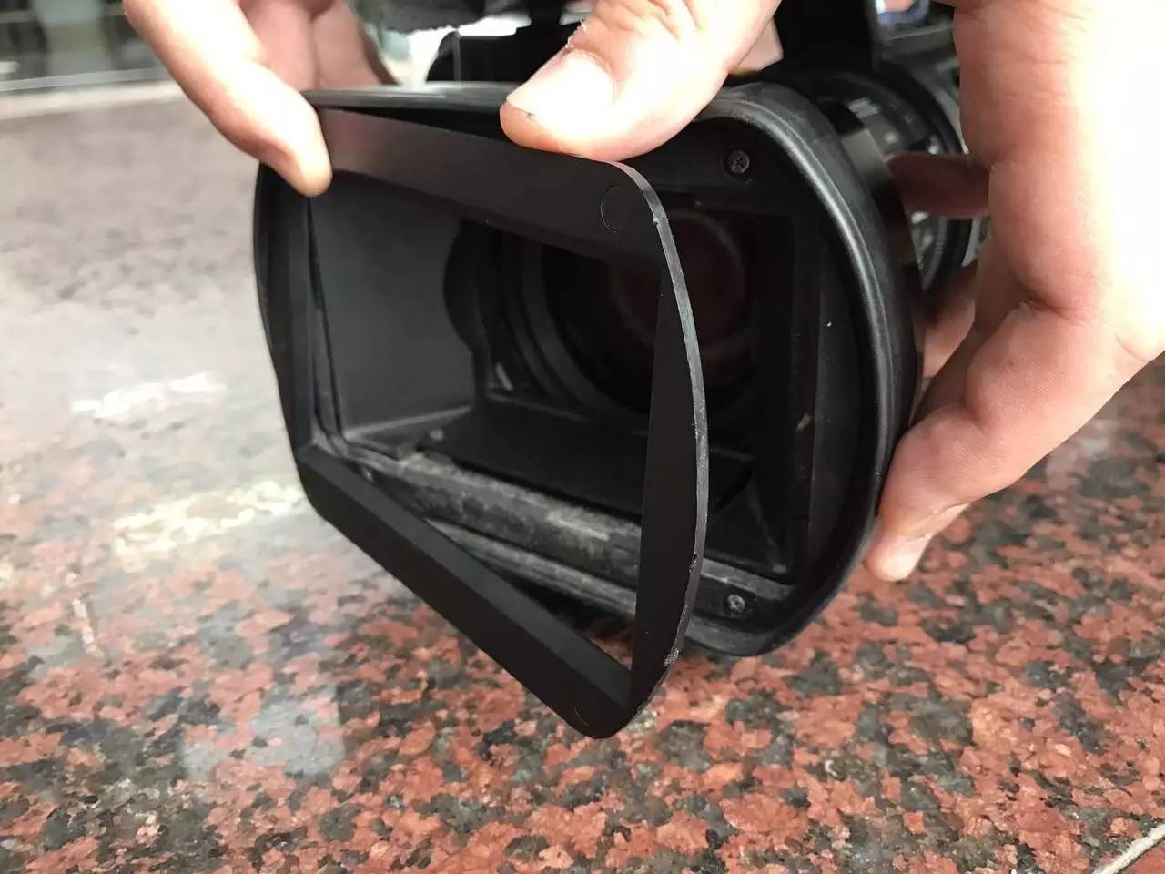 小编注:摄像机从三脚架上摔下来,镜头遮光板已经损坏,摄像机监视器不能正常工作。摄像机、相机都属于精密仪器,可能有很多的损坏是肉眼看不到的。经过技术部定损,修复该机器的损坏可能最少需要六千元。