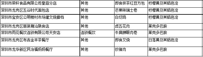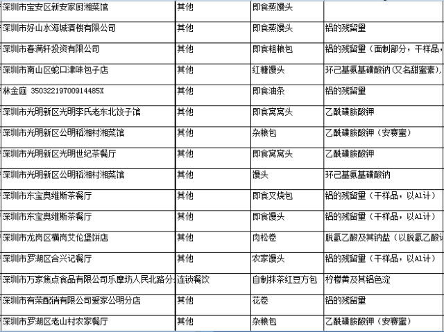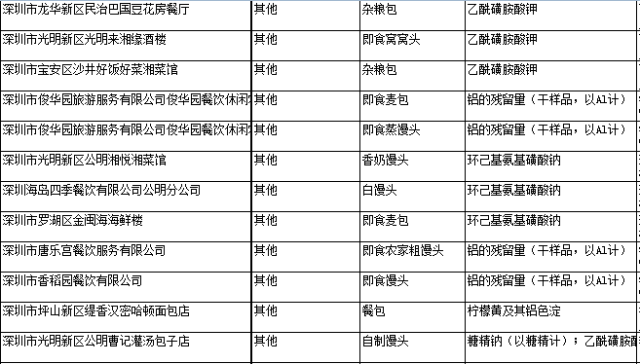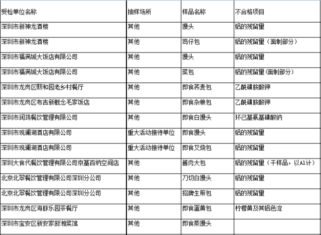 餐饮店:49家餐饮店检出不合格食品,包括新神龙酒楼、福满城大饭店、布吉新概念毛家饭店、大食代餐饮京基百纳店、南山区蛇口津味包子店等。